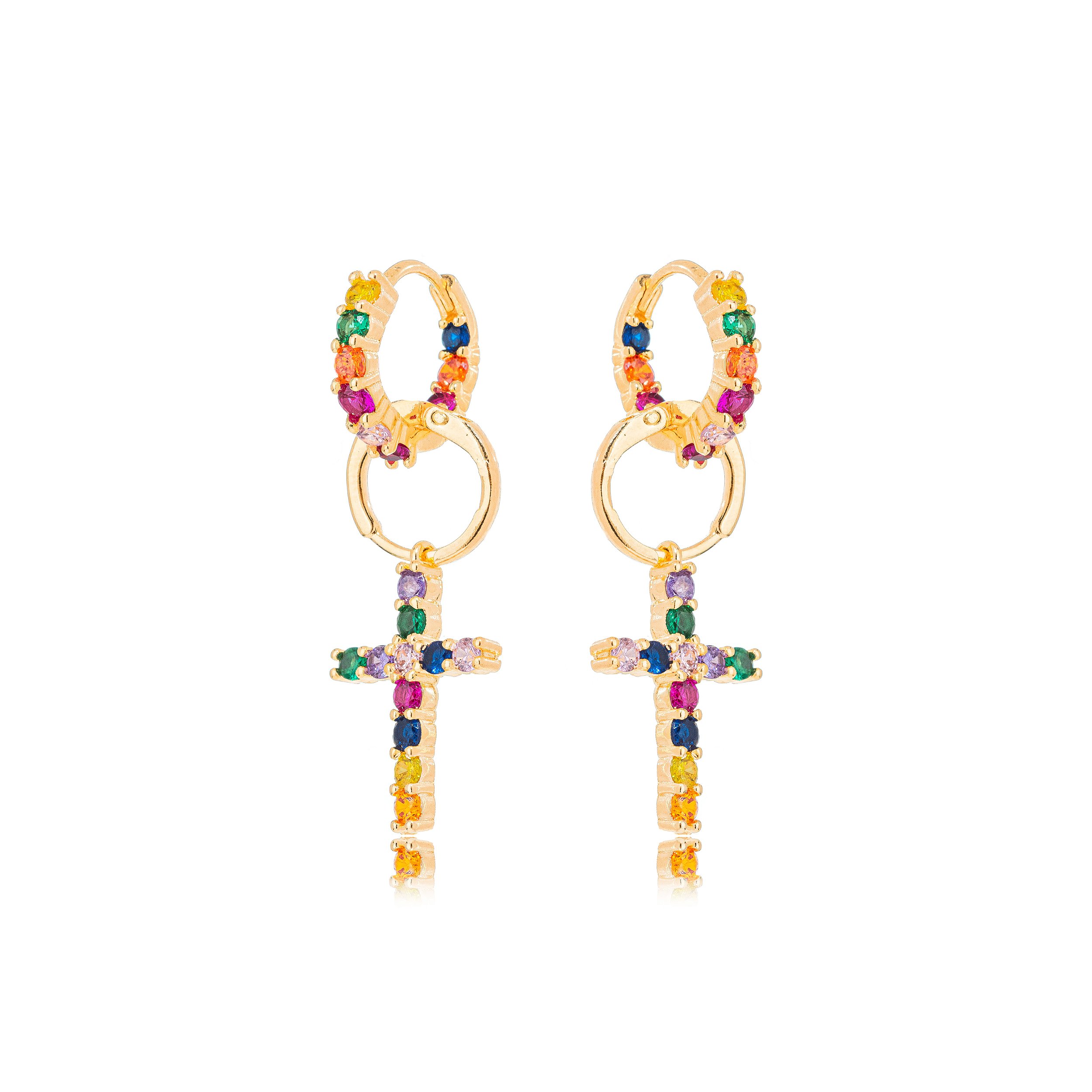As zircônias coloridas trazem alegria e luminosidade à peça, enquanto o símbolo da cruz representa fé e proteção, tornando este brinco uma escolha perfeita para quem gosta de acessórios marcantes e cheios de significado.