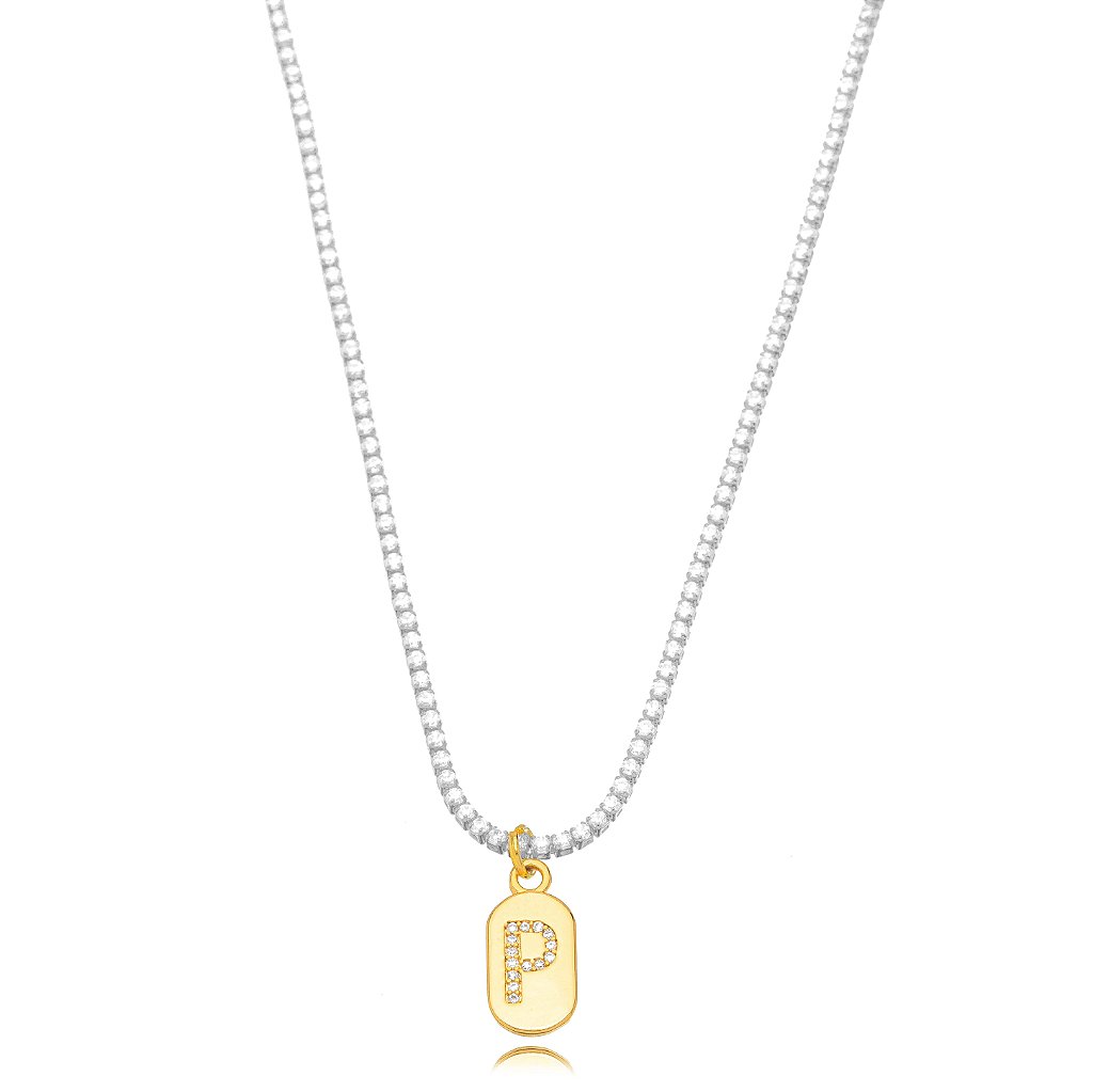 O pingente em formato de plaquinha com a letra P cravejada simboliza identidade, estilo e exclusividade, tornando a peça ideal para presentear ou eternizar uma inicial especial.