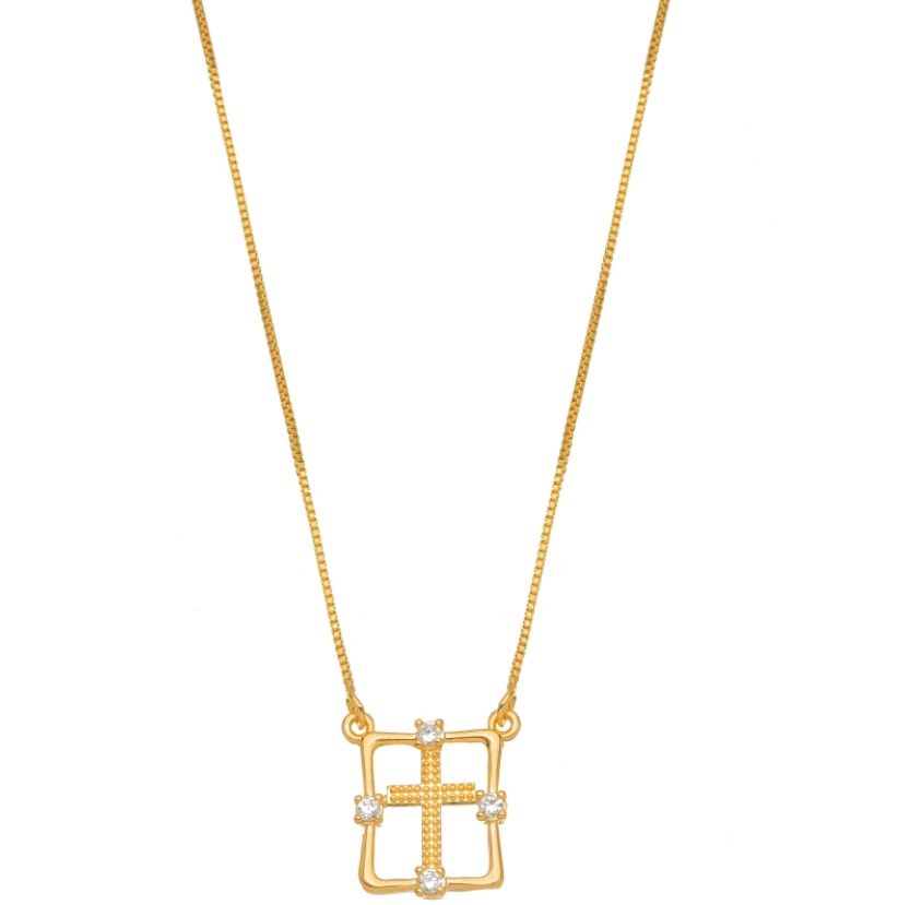 A corrente fina e elegante sustenta um pingente em formato retangular vazado, que traz ao centro uma cruz delicadamente trabalhada em microesferas de metal. Nas extremidades, cristais cravejados dão um toque de brilho sofisticado e moderno.