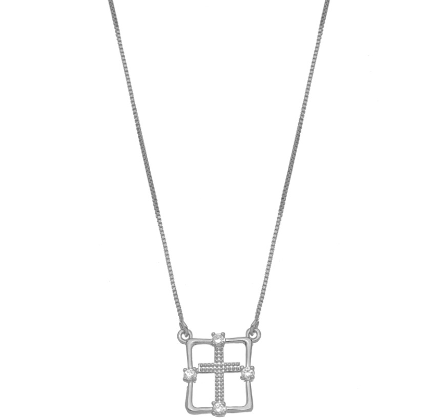 A corrente fina e elegante sustenta um pingente em formato retangular vazado, que traz ao centro uma cruz delicadamente trabalhada em microesferas de metal. Nas extremidades, cristais cravejados dão um toque de brilho sofisticado e moderno.