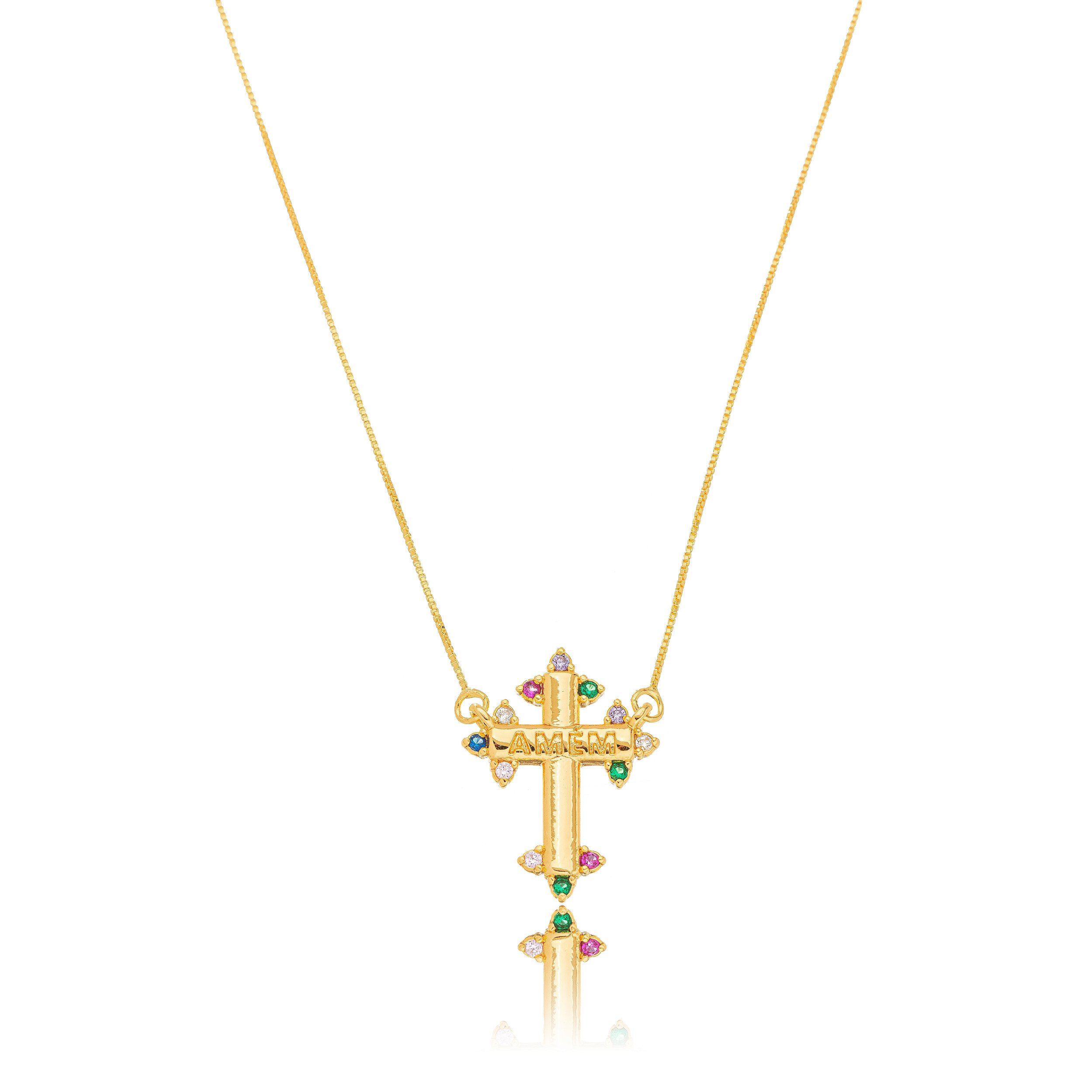 Colar Cruz Amém com Zircônias Coloridas – Banho de Ouro Amarelo 18K