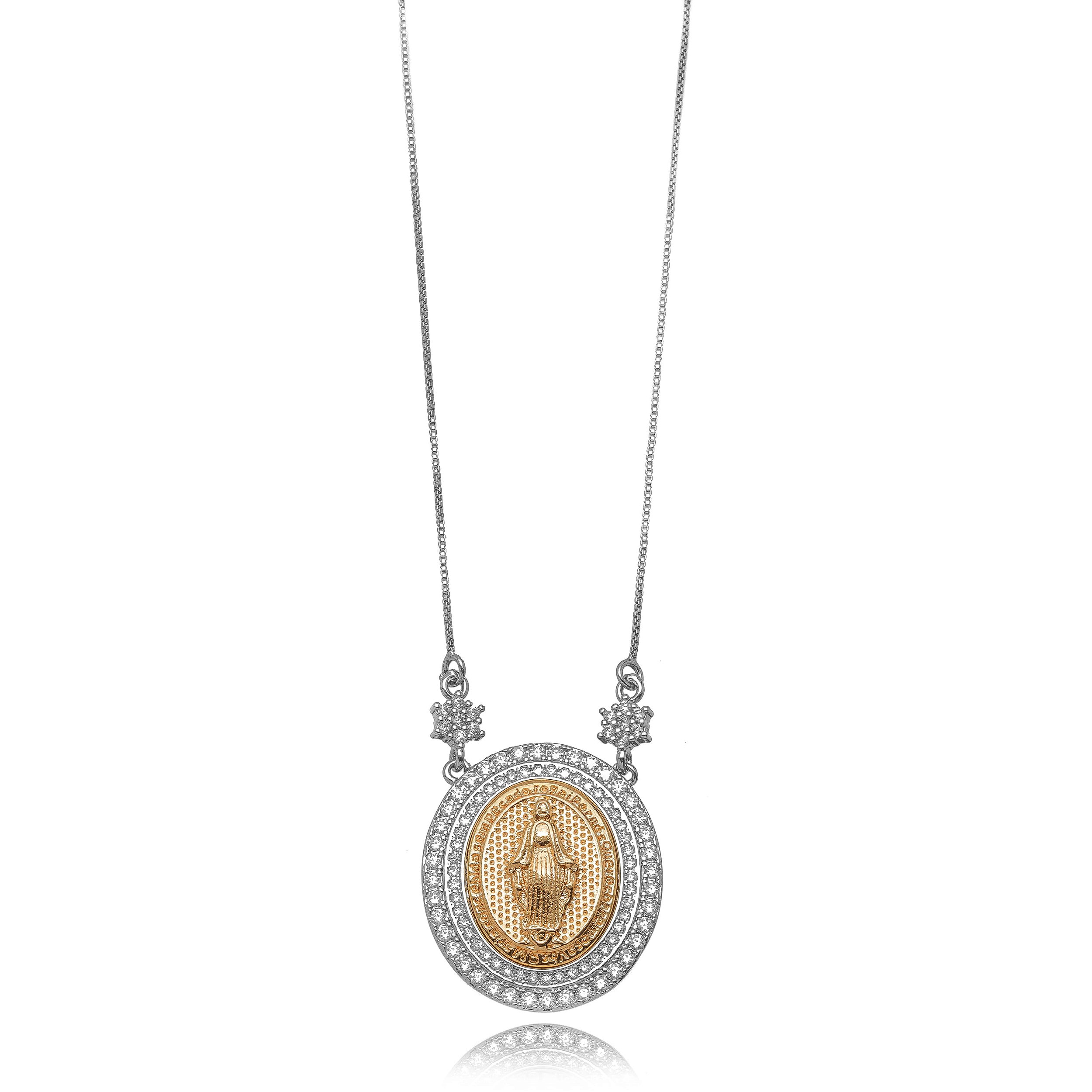 Colar Nossa Senhora Micro Zircônia Bicolor Confeccionado em Banho de Ouro Amarelo 18K e Ródio Branco