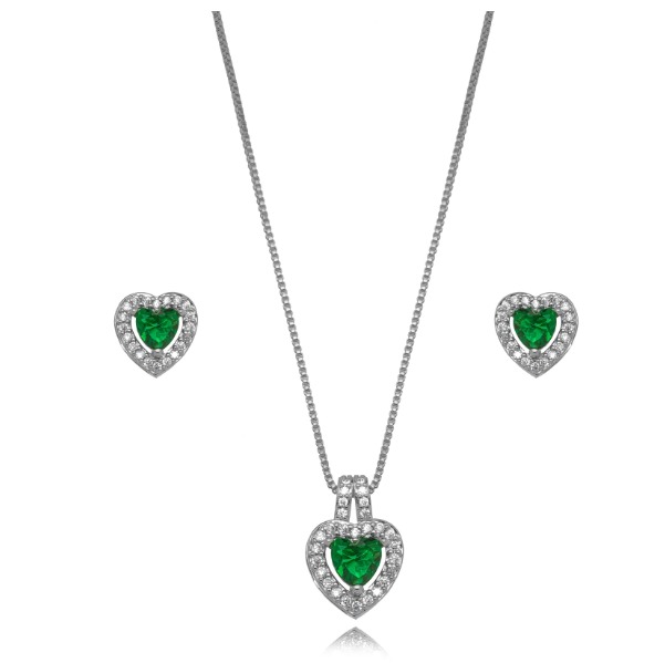 Conjunto Coração Cravejado com Zircônia Esmeralda – Banho de Ródio Branco