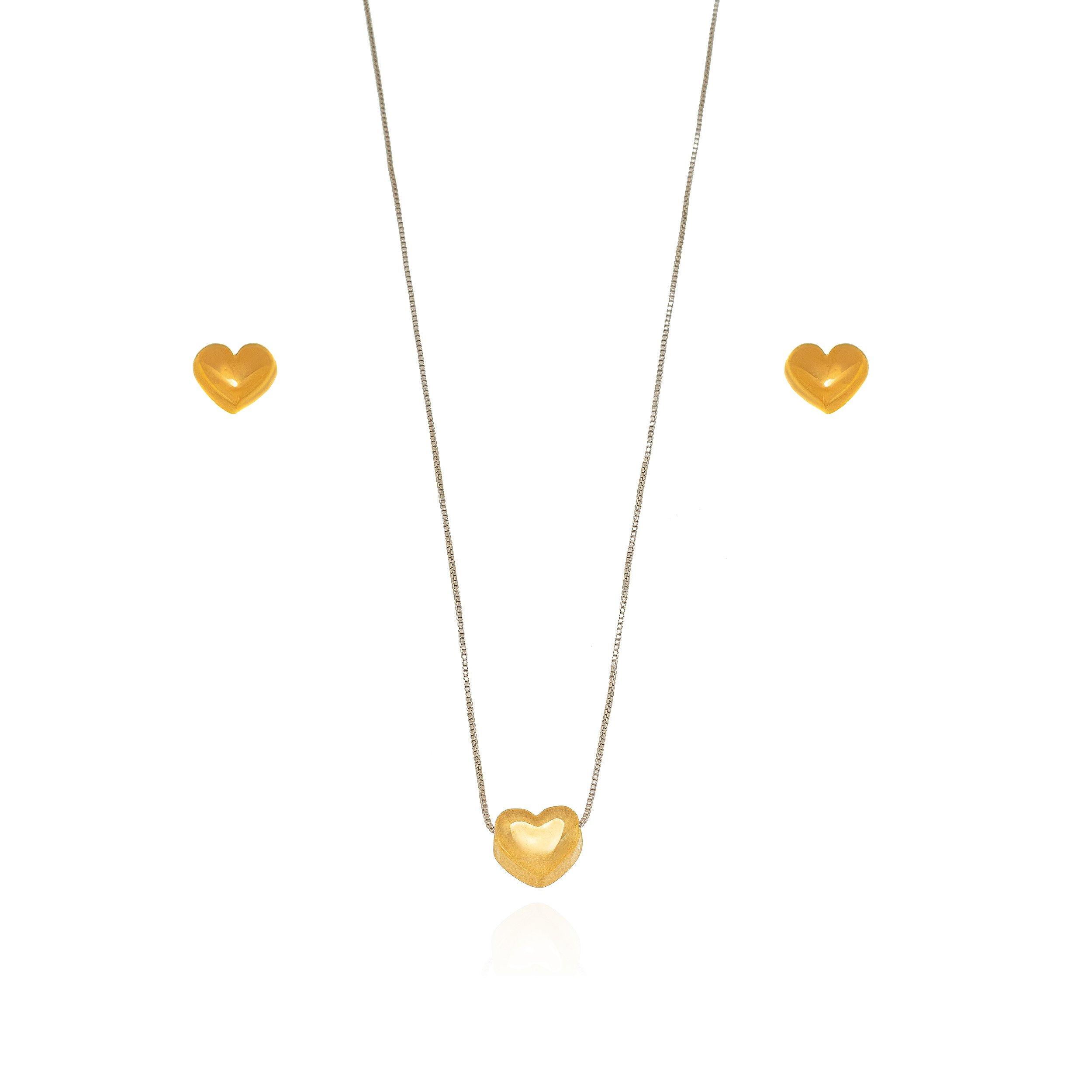 Conjunto Coração Liso em Banho de Ouro Amarelo 18k e Ródio Branco